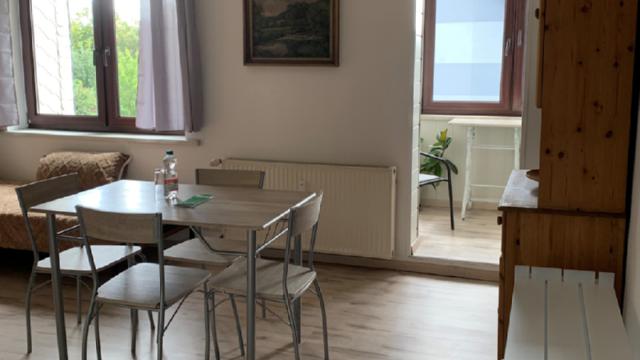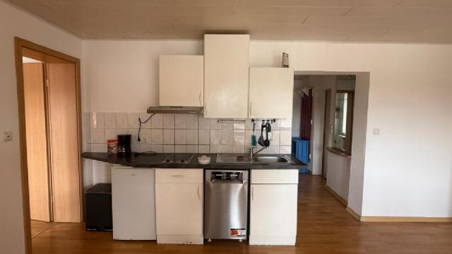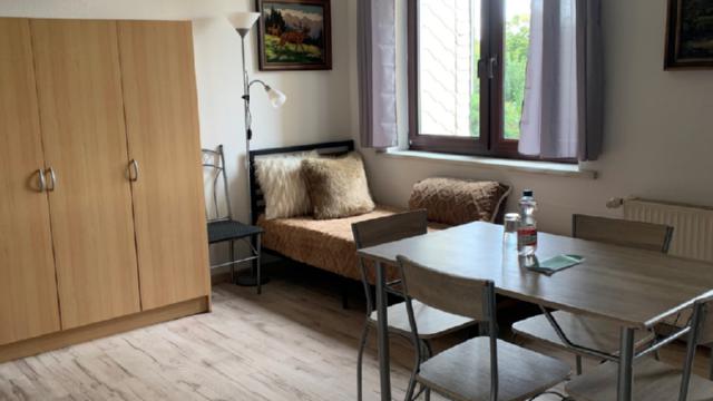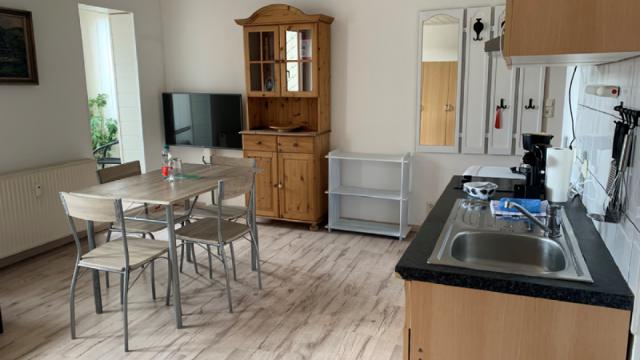 einer Wohnküche mit Essplatz (Kühlschrank, 2 Herdplatten, Geschirrspüler, Kaffeekocher, Wasserkocher)